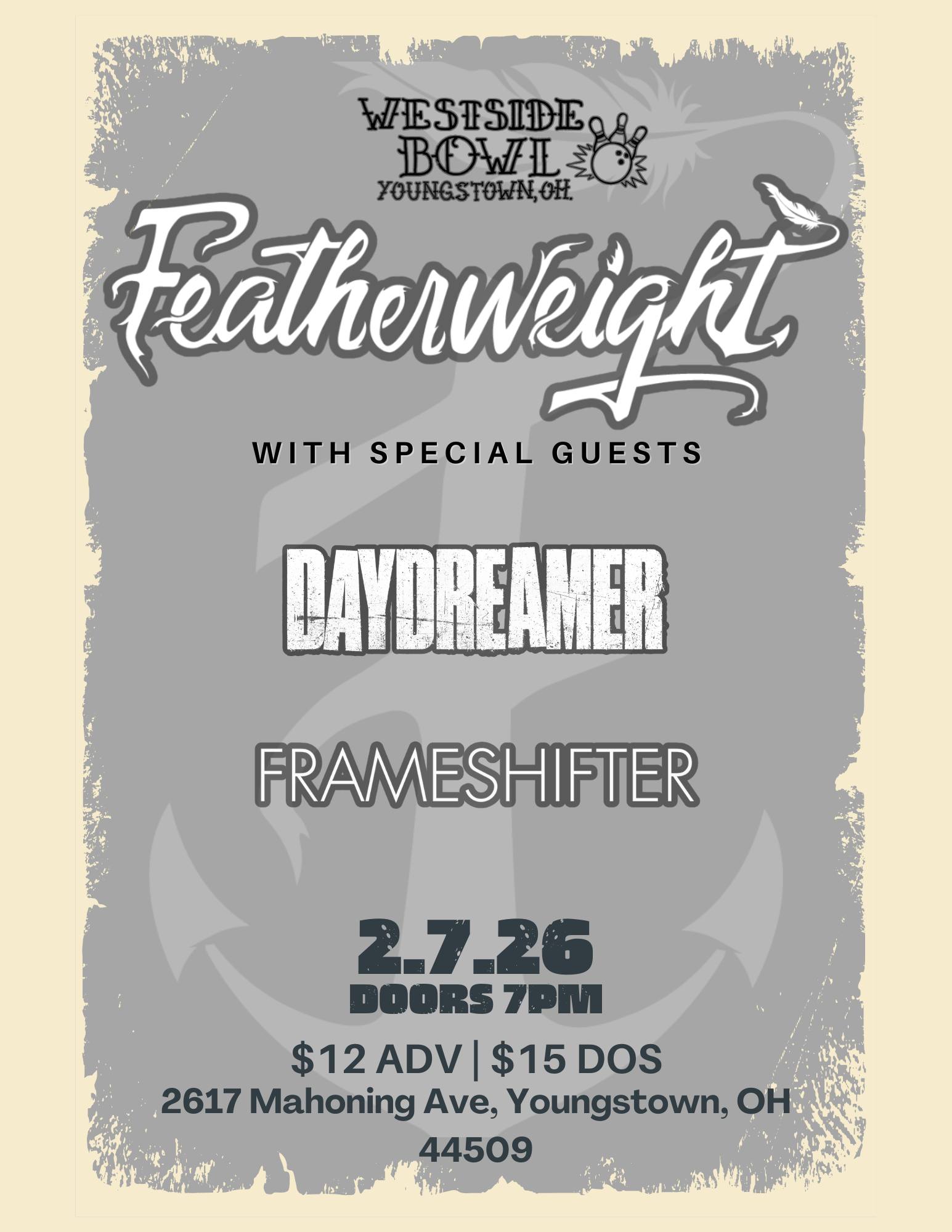 Saturday, February 7 — Featherweight with Daydreamer and Frameshifter live at Westside Bowl in Youngstown, Ohio. About the show Akron-based Featherweight brings a melodic metalcore approach that balances heavy guitar work with atmospheric layers and emotionally direct lyrics. Drawing influence from bands like Architects, Polaris, and Counterparts, their songs move between intensity and introspection, pairing […]