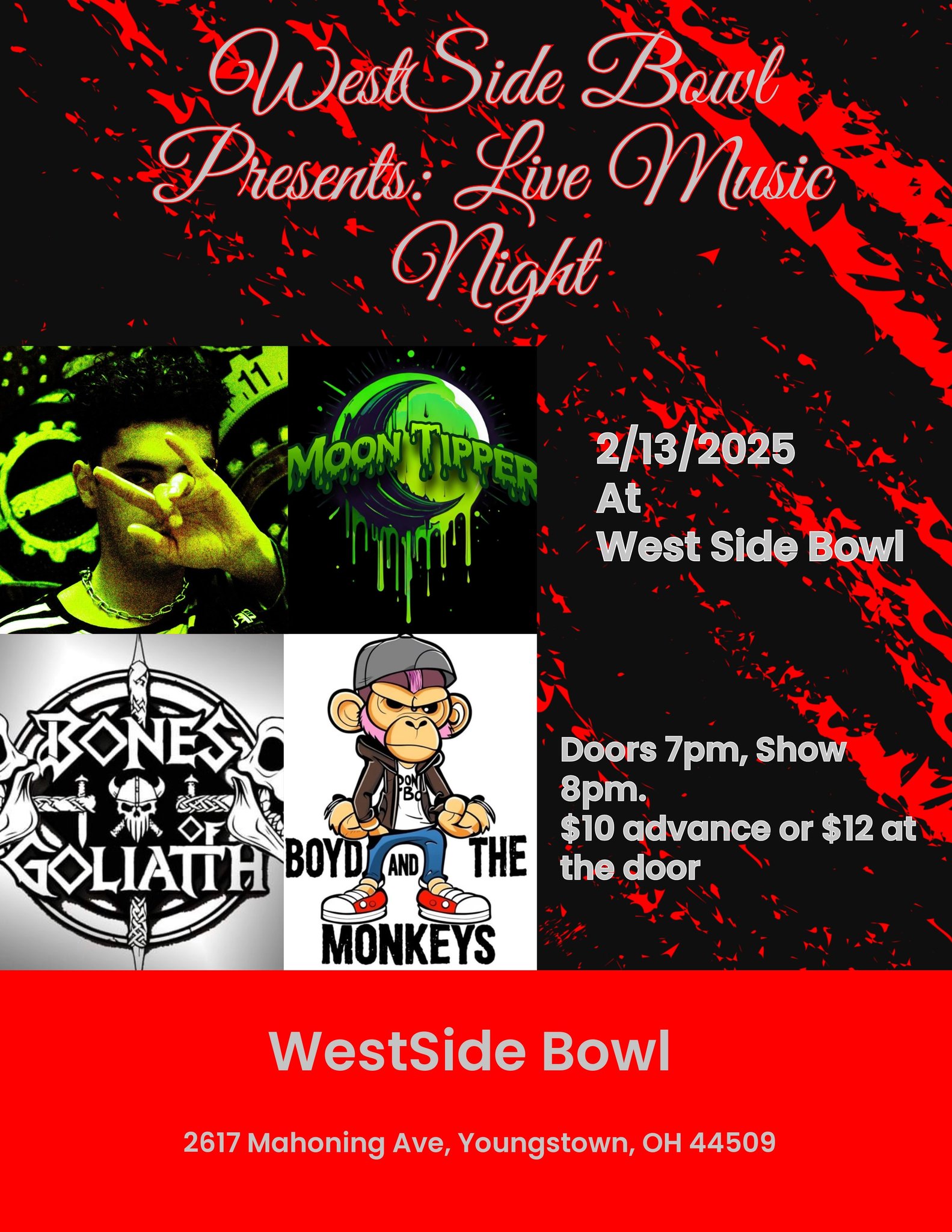 Friday, February 13, 2026 — Boyd & The Monkeys, Moon Tipper, Rey Angel, and Bones Of Goliath live at Westside Bowl. Show Details Doors: 7:00 PMShow: 8:00 PM Tickets $10 Advance$12 Day Of Lineup Boyd & The Monkeyshttps://linktr.ee/boydandthemonkeys Moon Tipperhttps://solo.to/moon_tipper Rey Angelhttps://www.fvr.fan/rey-angel Bones Of Goliathhttps://www.facebook.com/BonesOfGoliath |