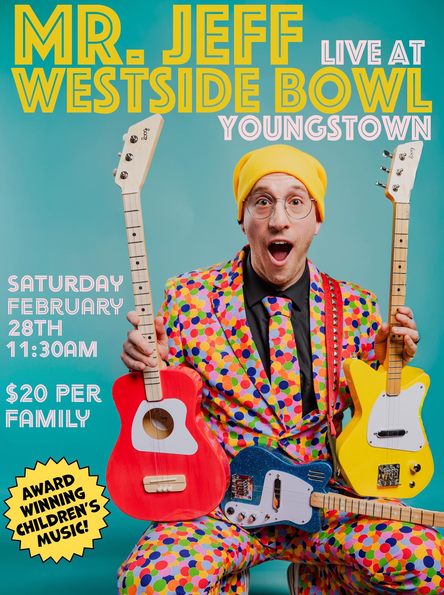 🎶 Mr. Jeff Live! 🎶 brings award-winning, silly-smart music to Westside Bowl for a high-energy family show that kids love and grownups secretly adore. Led by musician, educator, and former preschool teacher Mr. Jeff, this interactive performance blends music, movement, storytelling, and social-emotional learning into one joyful, giggle-filled experience.