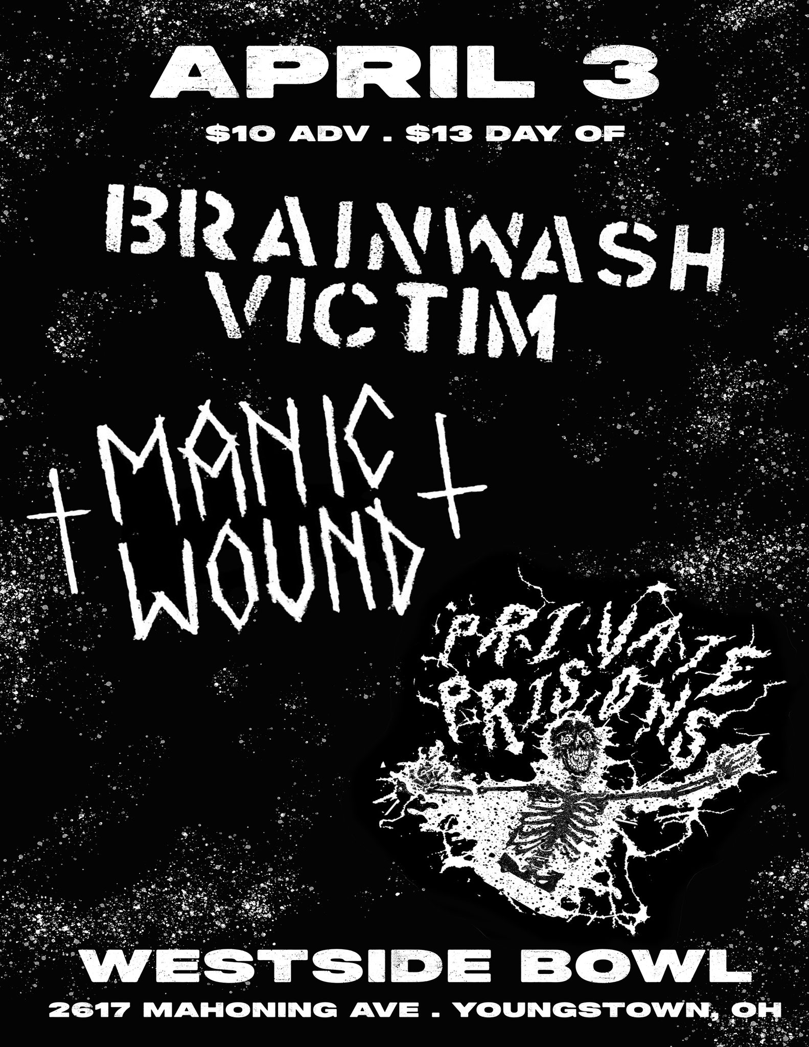 Brace for impact with Brainwash Victim 💀⚡ Bringing ferocious punk energy to the stage, joined by the crushing sludge weight of Manic Wound 🔥🎸 and the raw, hard-hitting force of Private Prisons 🚨 Expect blistering riffs, heavy atmosphere, and zero restraint.