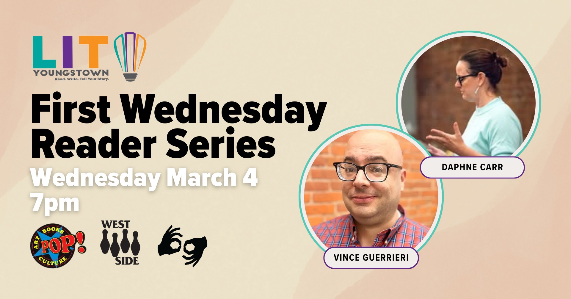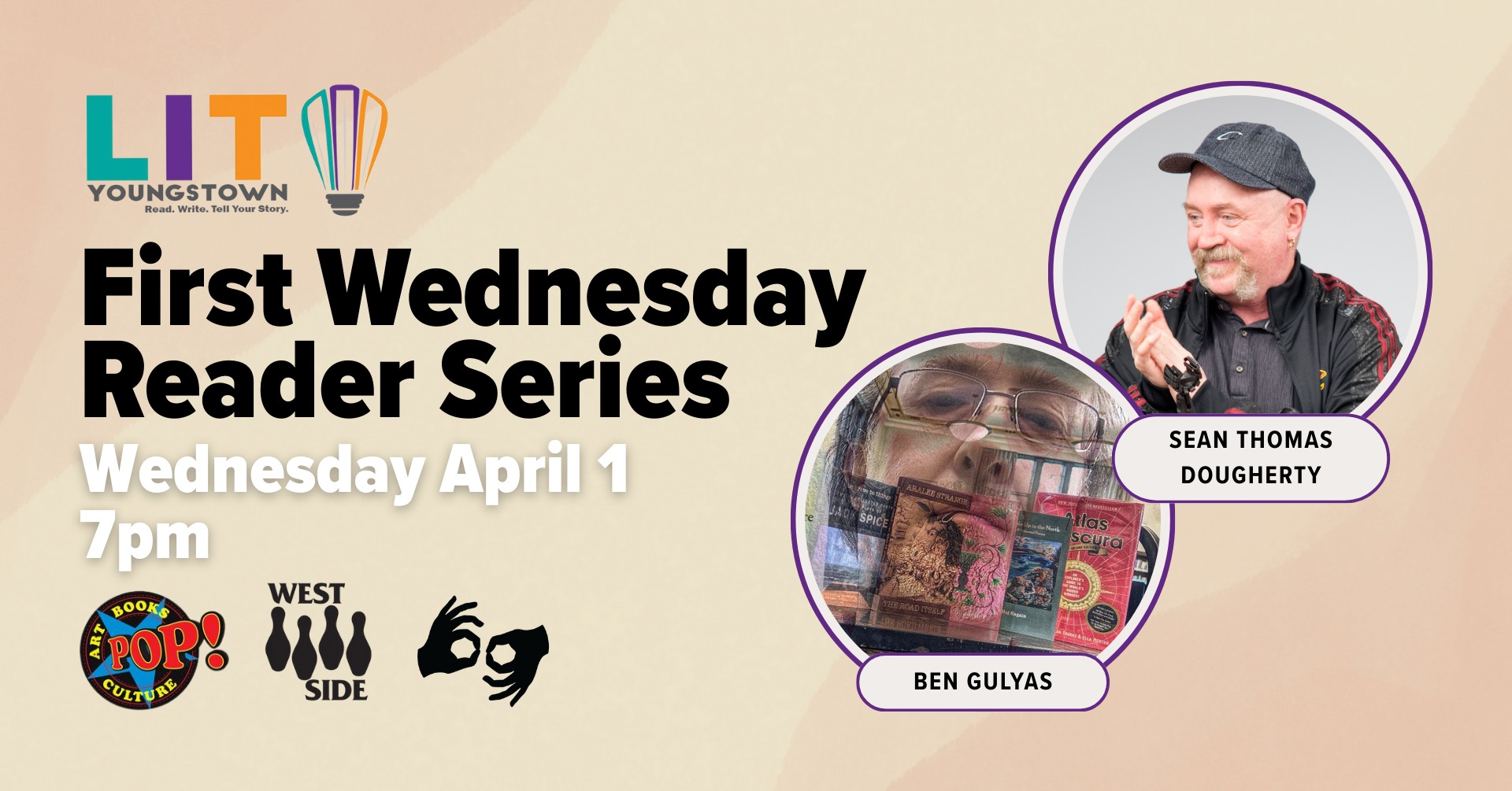 First Wednesday Reader Series presents poets Sean Thomas Dougherty (Erie) and Ben Gulyas (Cleveland) on Wednesday, April 1, 2026 at 7:00 PM at Westside Bowl. Erin Stubbs will co-host, with an open mic to follow. This reading will be downstairs in the Trophy Room, accessible only by stairs. Meagan Albani will provide ASL interpretation. The […]